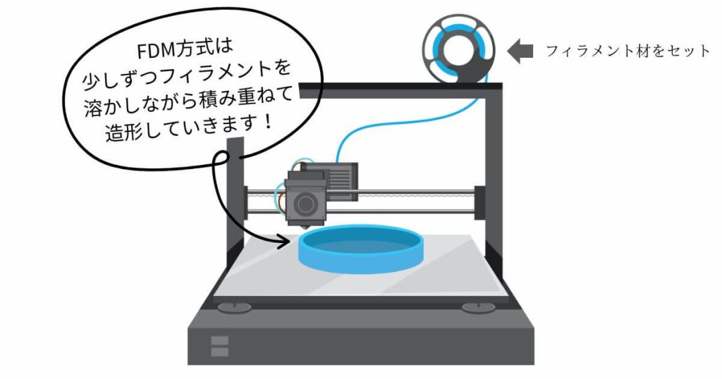 熱溶解積層方式(略称:FFF)は家庭用3Dプリンターの中では最も一般的な積層方式です。