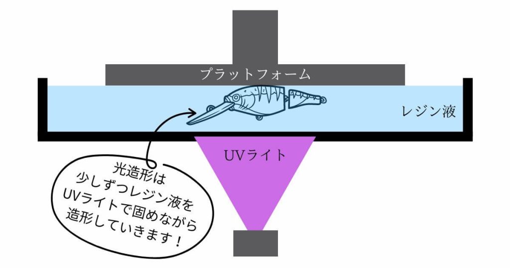 光造形方式(略称:SLA)はUVライトで硬化するレジンを使用し、光を照射して少しずつ硬化させることで立体物をプリントします。