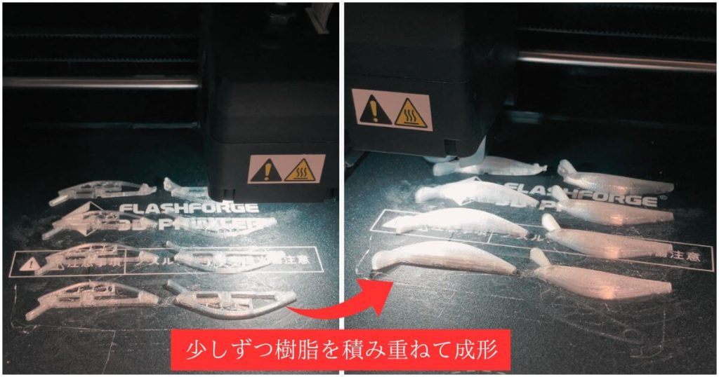 この2つの造形方式は使う材料や造形方法が全く異なるので作れるルアーにも当然違いがあります。